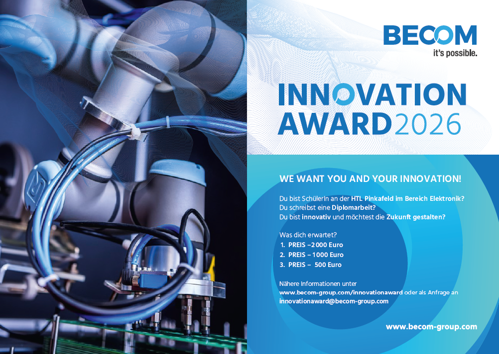 Willkommen auf der offiziellen Seite des BECOM Innovation Awards, einer prestigeträchtigen Auszeichnung, die herausragende Diplomarbeiten im Bereich Elektronik würdigt und die Partnerschaft zwischen der HTL Pinkafeld und der BECOM-Gruppe stärkt.